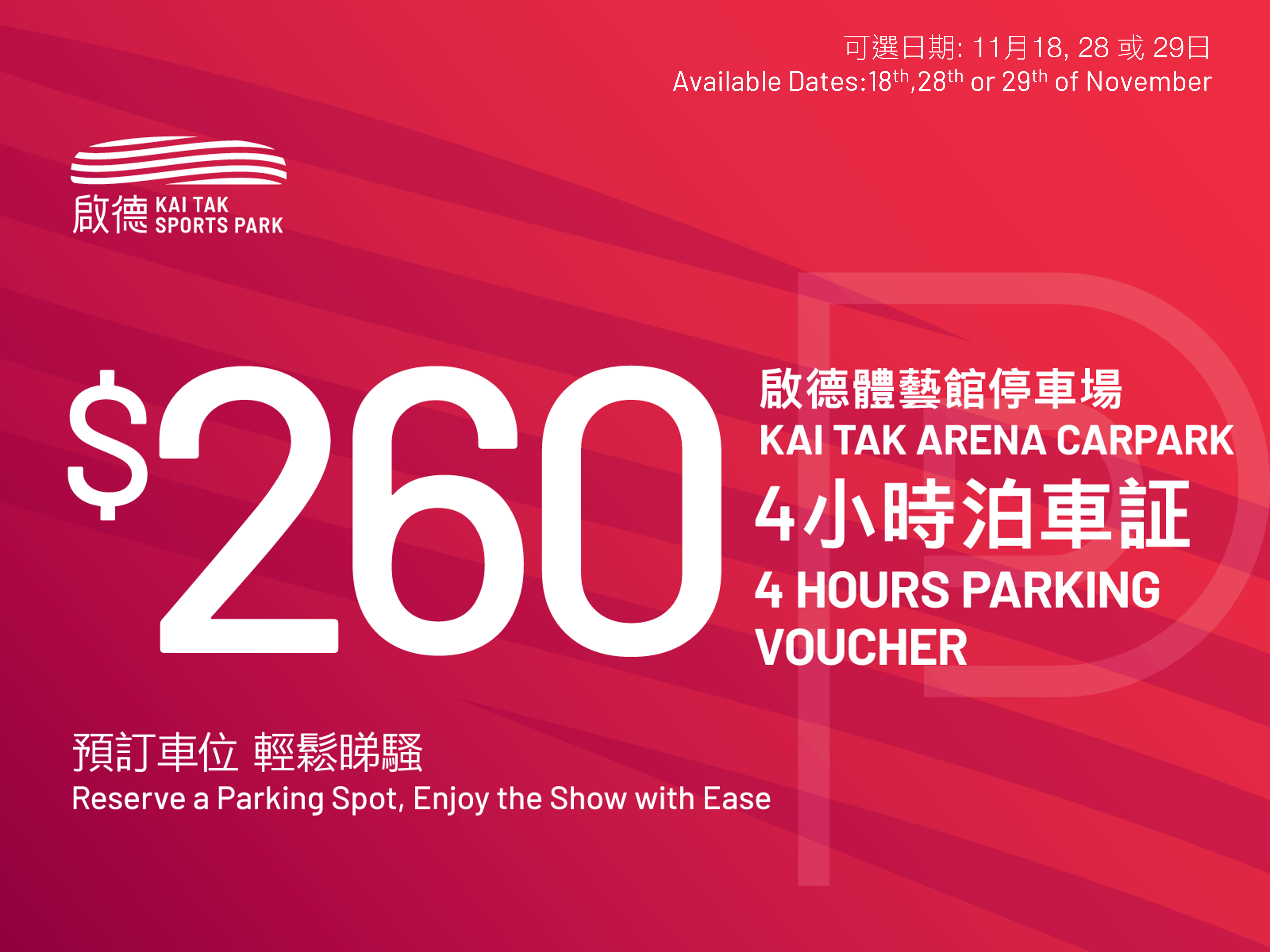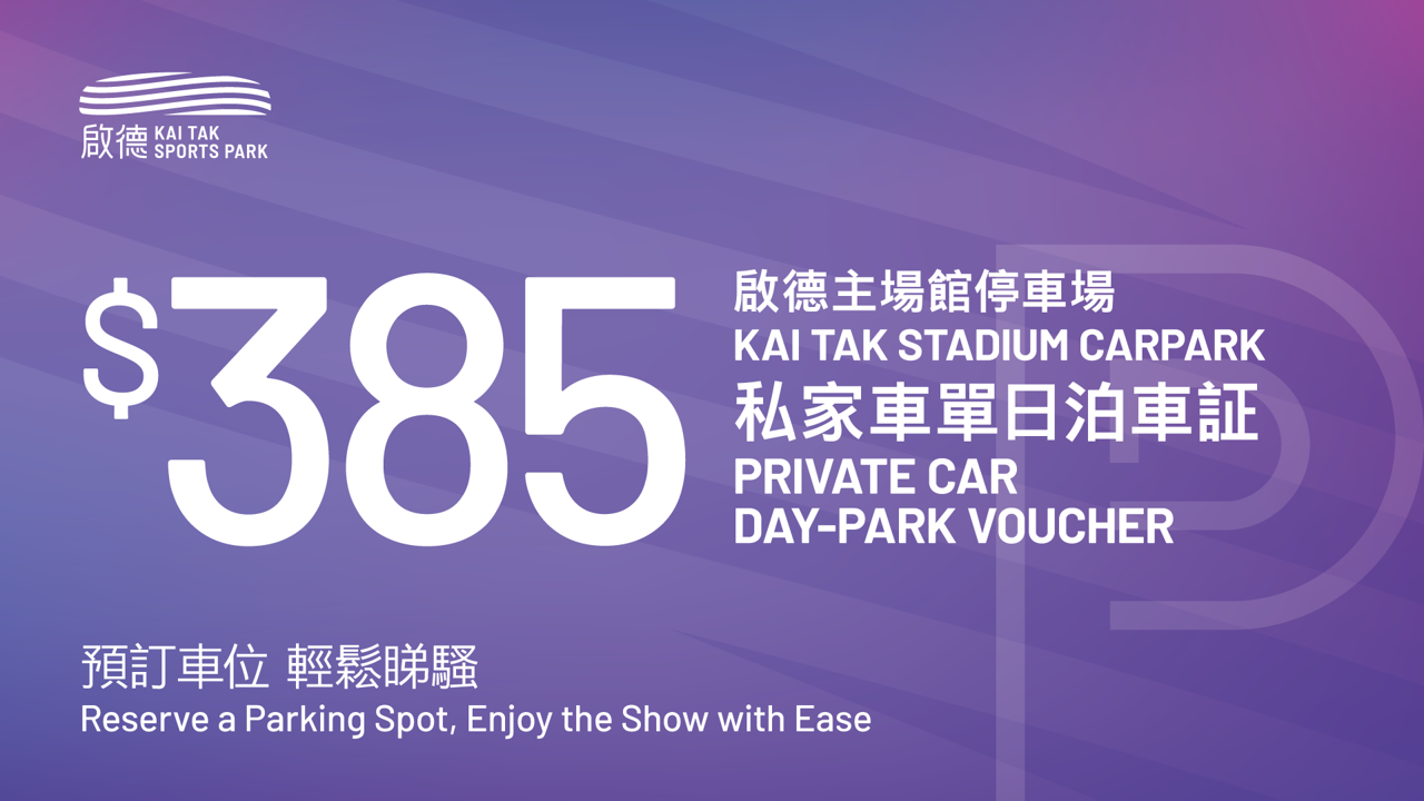 From now on, purchase day-park voucher in HK Ticketing. The voucher is valid for multiple entries to Kai Tak Stadium Carpark.