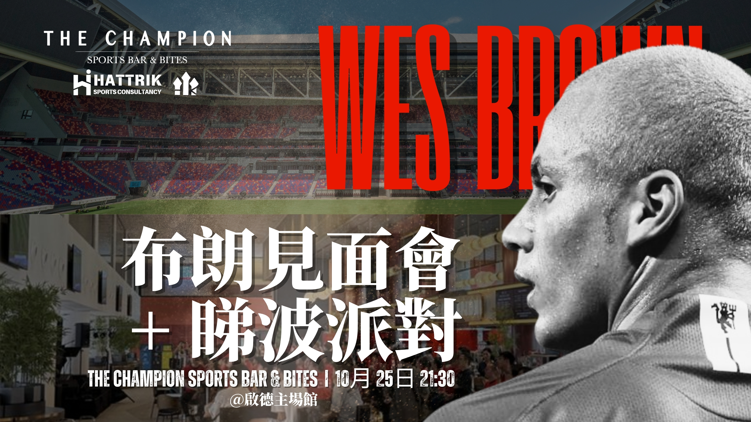 英格蘭足球超級聯賽進入第9輪賽事,曼聯主場迎戰白禮頓,全港最大運動酒吧THE CHAMPION將進行直播外,更夥拍港式紅魔及Hattrik Football舉行「曼聯傳奇球星布朗見面會+睇波派對」。活動當日布朗將會親臨現場與大家見面、分享及合照,再一齊觀看球賽直至完場!